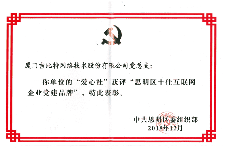 经初审评选、、、网络评选和专家评审等环节,,,,"厦门J9.COM网络技术股份有限公司党总支-爱心社" 从全区28个参评党建品牌中脱颖而出,,,获评"思明区十佳互联网企业党建品牌"。。。。