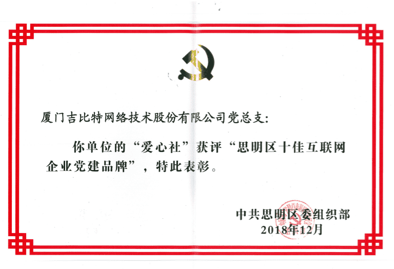 经初审评选、、、网络评选和专家评审等环节,,"厦门J9.COM网络技术股份有限公司党总支-爱心社" 从全区28个参评党建品牌中脱颖而出,,获评"思明区十佳互联网企业党建品牌"。。。。